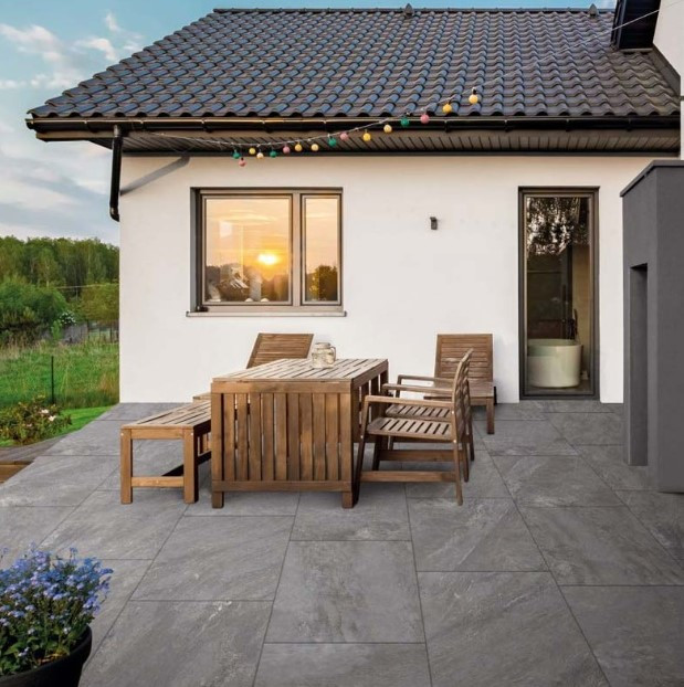 Superficie antiscivolo R11 smaltata effetto pietra grigia.