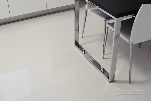 Pavimento in gres porcellanato levigato lucido bianchissimo con trattamento nano-tech, trattamento che rende la superficie impermeabile e ben pulibile, Inassorbente e morbida rispetto a un levigato tradizionale. 1°Scelta, spessore 9 mm, rettificato lucido a specchio. Formati disponibili 60x60, 80x80, 60x120 e 120x120. Ottimo per locali pubblici e abitazioni private. Disponibile il battiscopa uguale al pavimento e gradino step e gradino costa retta per la scala. Un prodotto di grande qualità ed effetto estetico.