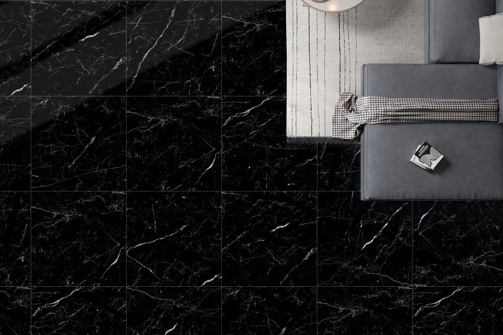 Pavimento in gres porcellanato levigato Black Marquinia con venatura bianca.