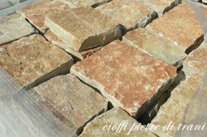 Piastrelle in Pietra di Trani, un altro derivato della lavorazione di tranciatura, il pavimento in Pietra di Trani squadrata é largamente utilizzato per la pavimentazione di superfici quali viali carrabili, marciapiedi, rampe in salita, piazze e tanto altro ancora. Questo derivato é inoltre largamente utilizzato per la realizzazione di rivestimenti e muratura a cemento o a secco.