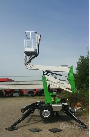 Modello X trailer, altezza di lavoro 12 metri, sbraccio 4,5 metri con 200 kg, portata in navicella 200kg con navicella in tubolare dim 1000x700x1100, impianto corrente 220V in navicella,Motore ausiliario benzina Impianto manovre piattaforma totalmente idraulico, articolazione singola, appendice ad un asse, possibilità di traslazione indipendente tramite due motori idraulici posizionati sulle gomme, traino con patente B purché non superi i 35q di ptt massa trainante + trailer (11 q.li).