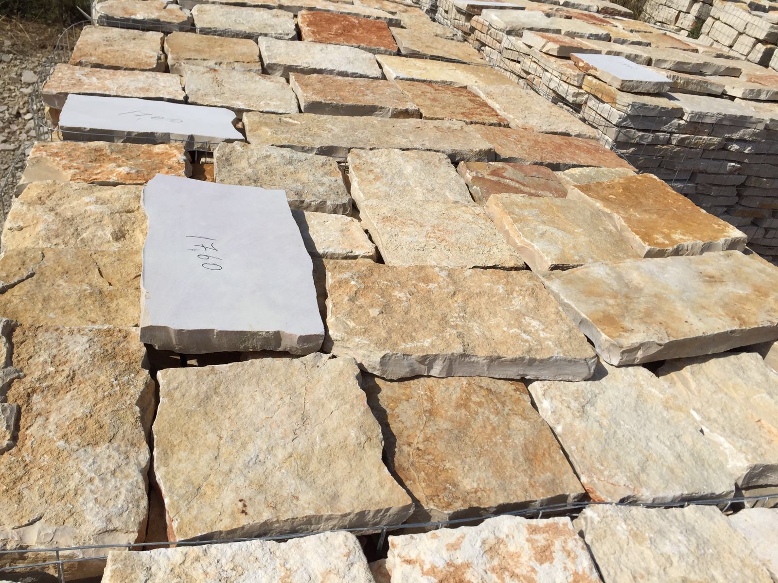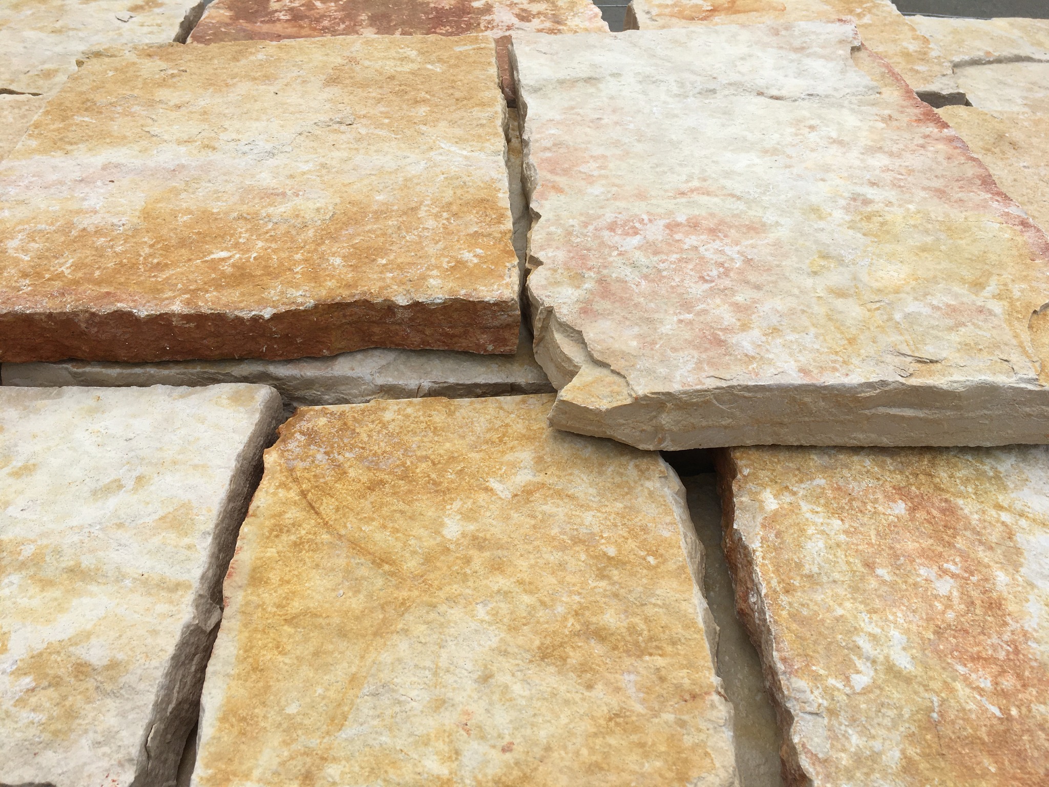 Pietra di Trani da pavimento squadrata segata, spessore 3-4 cm, disponibile nei colori bianco e giallo tipico.