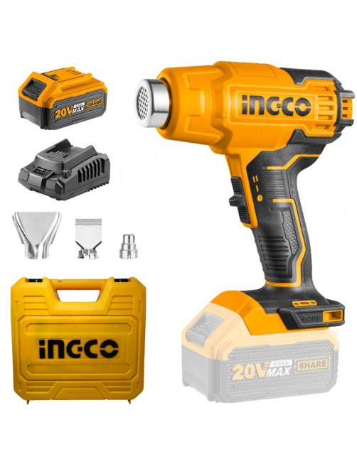 Termosoffiatore a batteria 20V Ingco HGLI20025: 300/550°C, flusso d'aria 100/200 l/min, incluso batteria, caricatore e accessori.