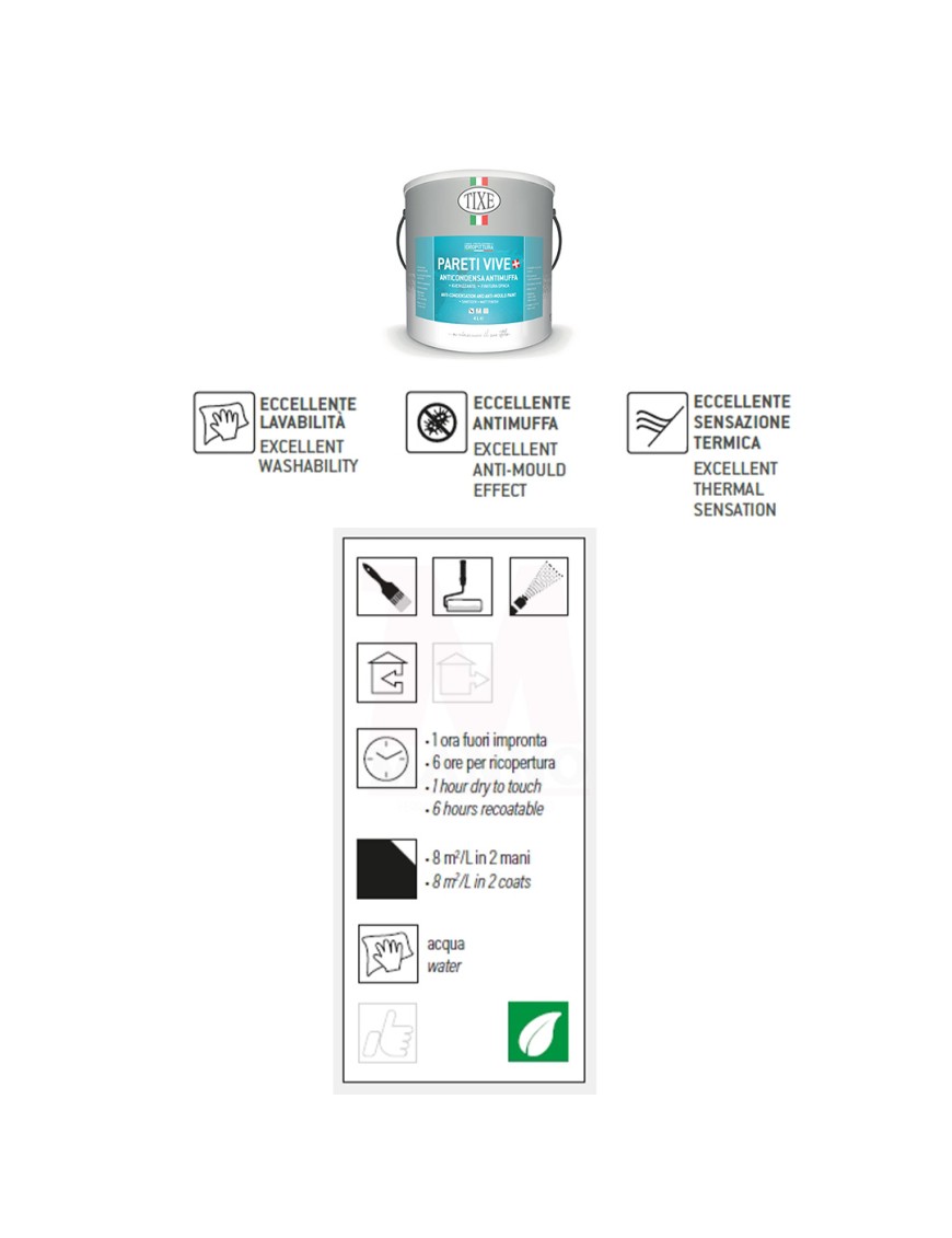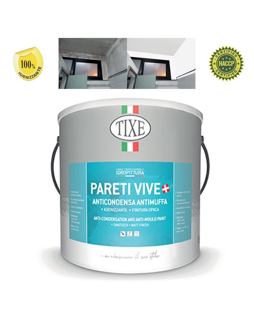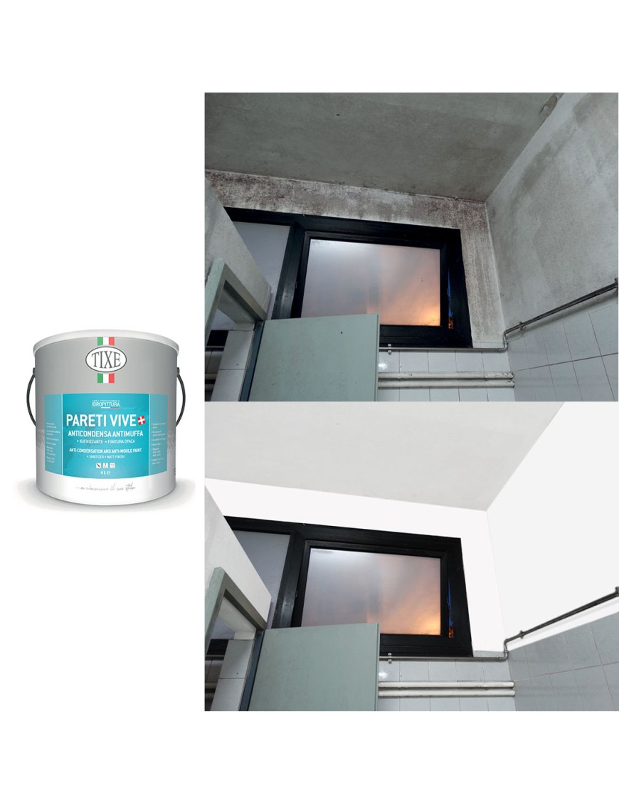 Tixe Pareti Vive Anticondensa con Antimuffa è una pittura lavabile traspirante per interni, caratterizzata da eccezionale potere antimuffa e anticondensa con microsfere cave di vetro. Le proprietà termoisolanti e fonoassorbenti riducono la dispersione di calore attraverso le pareti impedendo la formazione di efflorescenze e muffe. Ideale come igienizzante negli ambienti interni dove c'è presenza di umidità causata da condensa, come spogliatoi, docce, bagni e cucine.