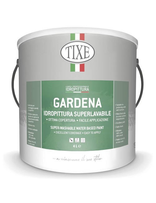Tixe Gardena è un'idropittura superlavabile per interni ed esterni, indicata per la protezione e decorazione di tutte le superfici murali nuove o precedentemente pitturate. Di facile applicazione, possiede ottima copertura sia da asciutto che da bagnato, ottima dilatazione e tempo aperto; unisce alla decorazione, eleganza e perfezione di risultato. Lavabile con spugna umida, dopo minimo 15 giorni dall'applicazione dell'ultima mano.