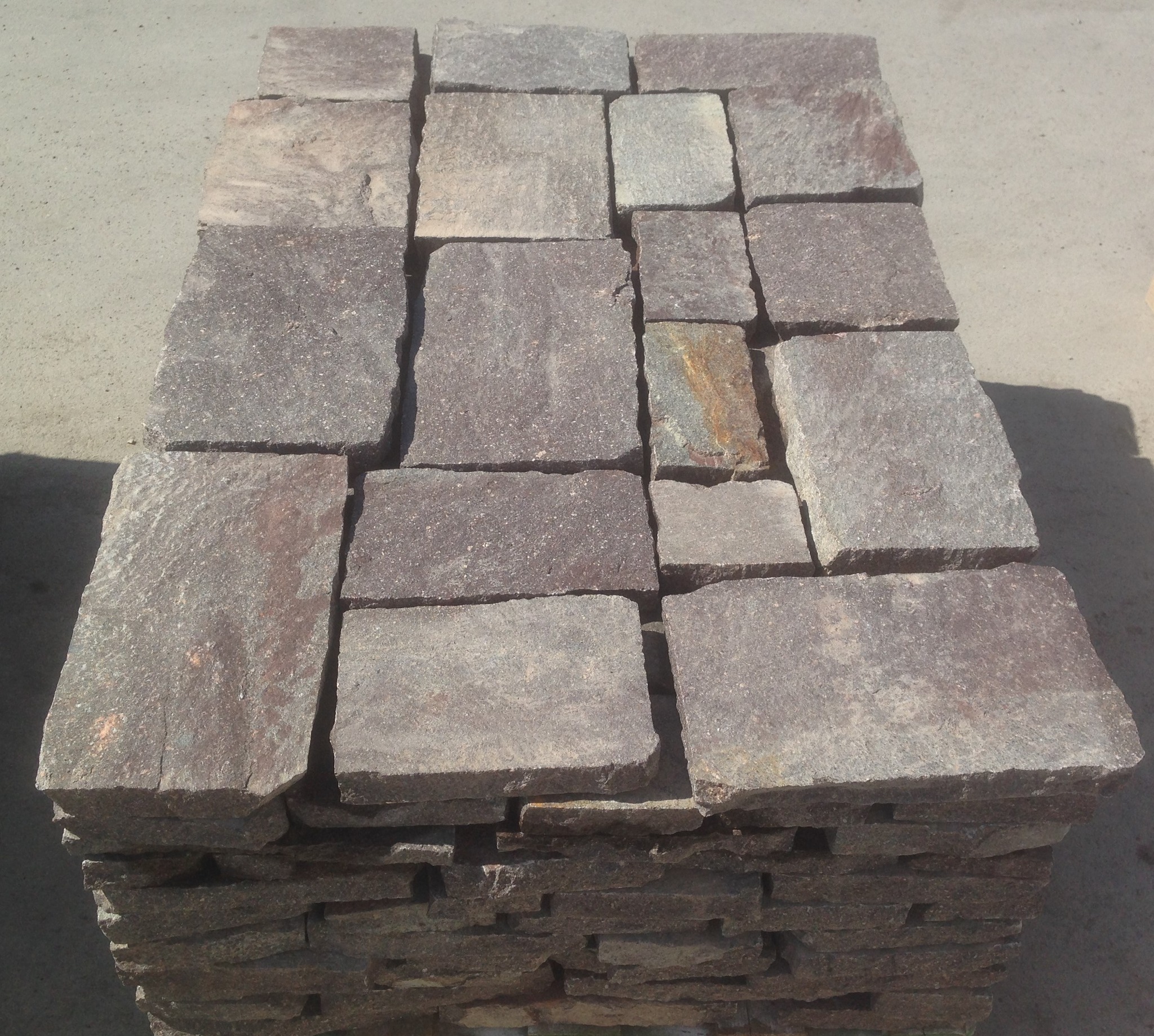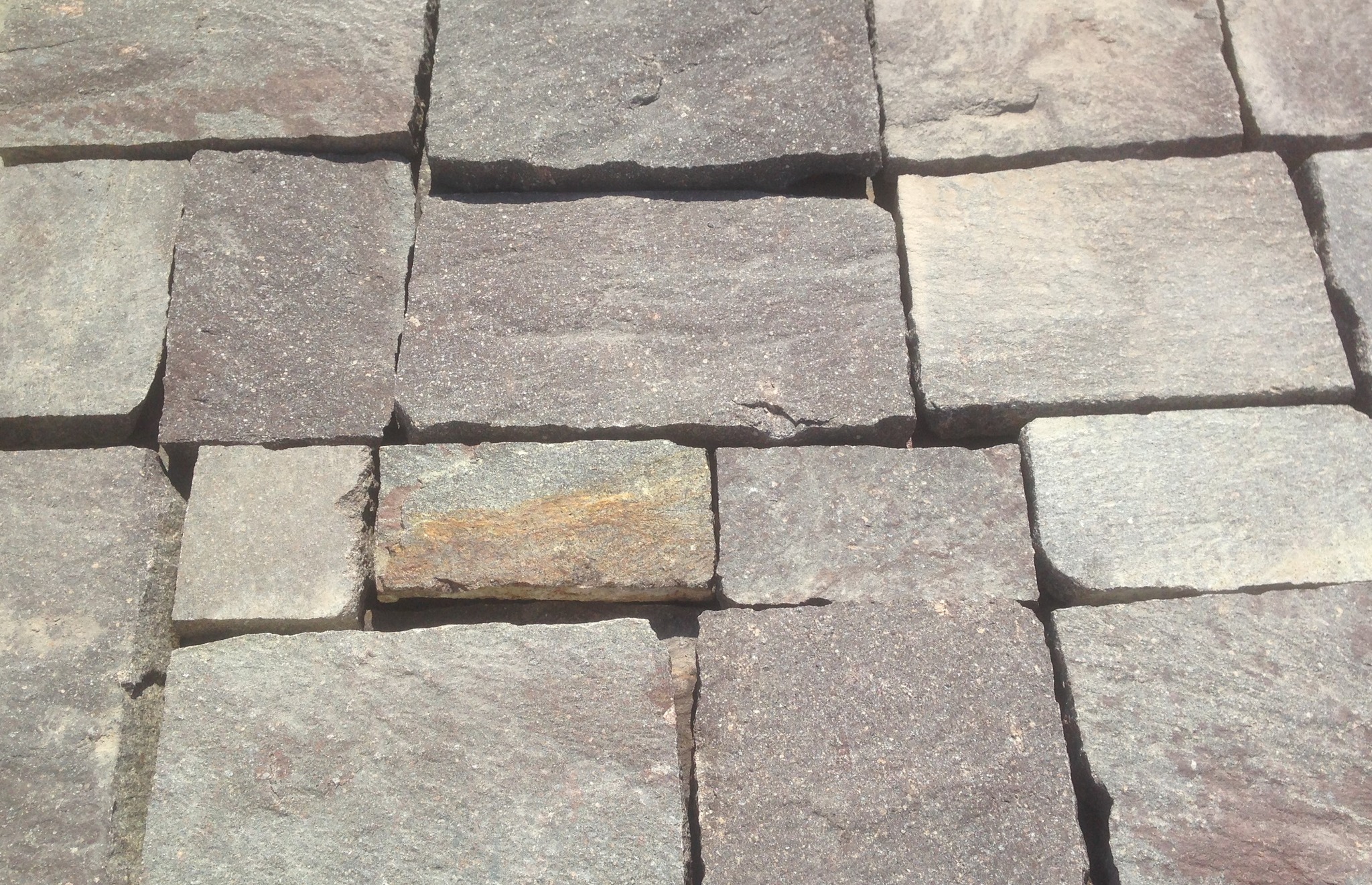 Porfido trentino da pavimento squadrato, spessore 3-5 cm, disponibile nel colore grigio-viola.