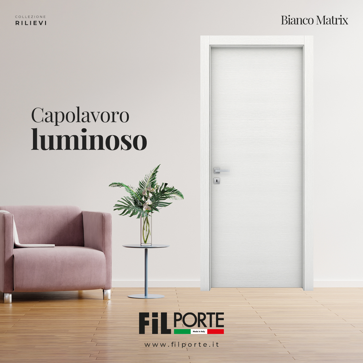 Porta in laminato bianco matrix spazzolata adatta ad ambienti moderni. L'anta rifinita e bordata su 4 lati. Spessore pannello anta pari a 44 mm. Cornici piatte da 75 mm. Spedizione a parte.