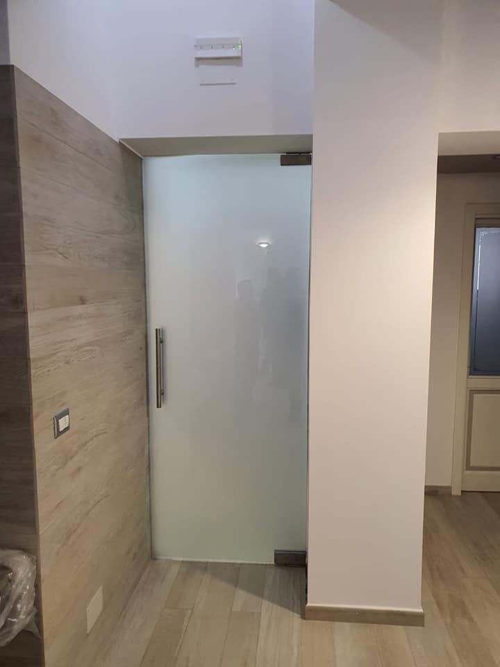 Porta in vetro,conĀ chiusura automatica rallentata,totalmente in vetro temperato e stratificato effetto satinato.