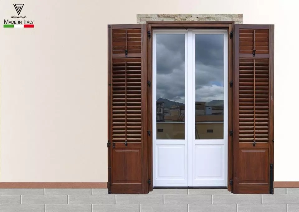 Portafinestra 2 ante Vetrata e Persiana in legno colore vetrata laccato bianco colore persiana noce chiaro.