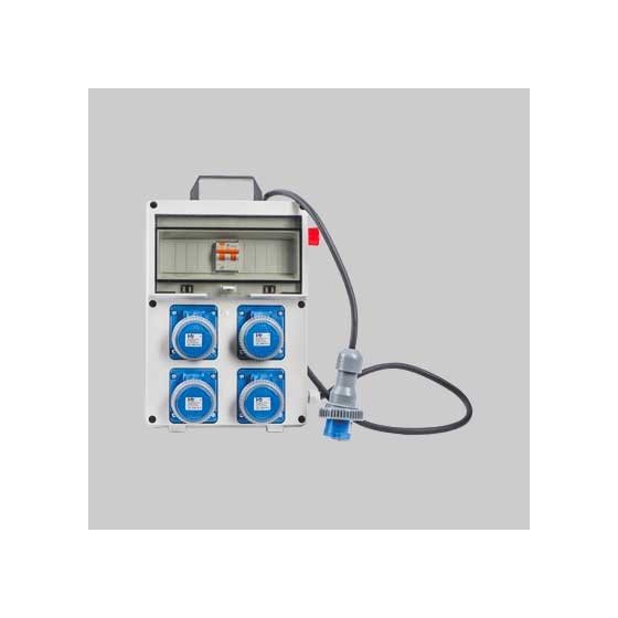QUADRO DI DISTRIBUZIONE 220V C/PULSANTE DI EMERGENZA cm 25,5x12,5x35,5h - Da cantiere portatili o da parete. Cablati in fabrica. In termoplastico con 4 prese 2P+T 16 A 230V IP67 con pulsante di emergenza. Int. Magnetotermico 1P+N. Differenziale da 16 A 1P+N 0,03 A 4,5 KA - 3KW. Alimentazione cavo e spina 2P+T 16 A 230V IP67.