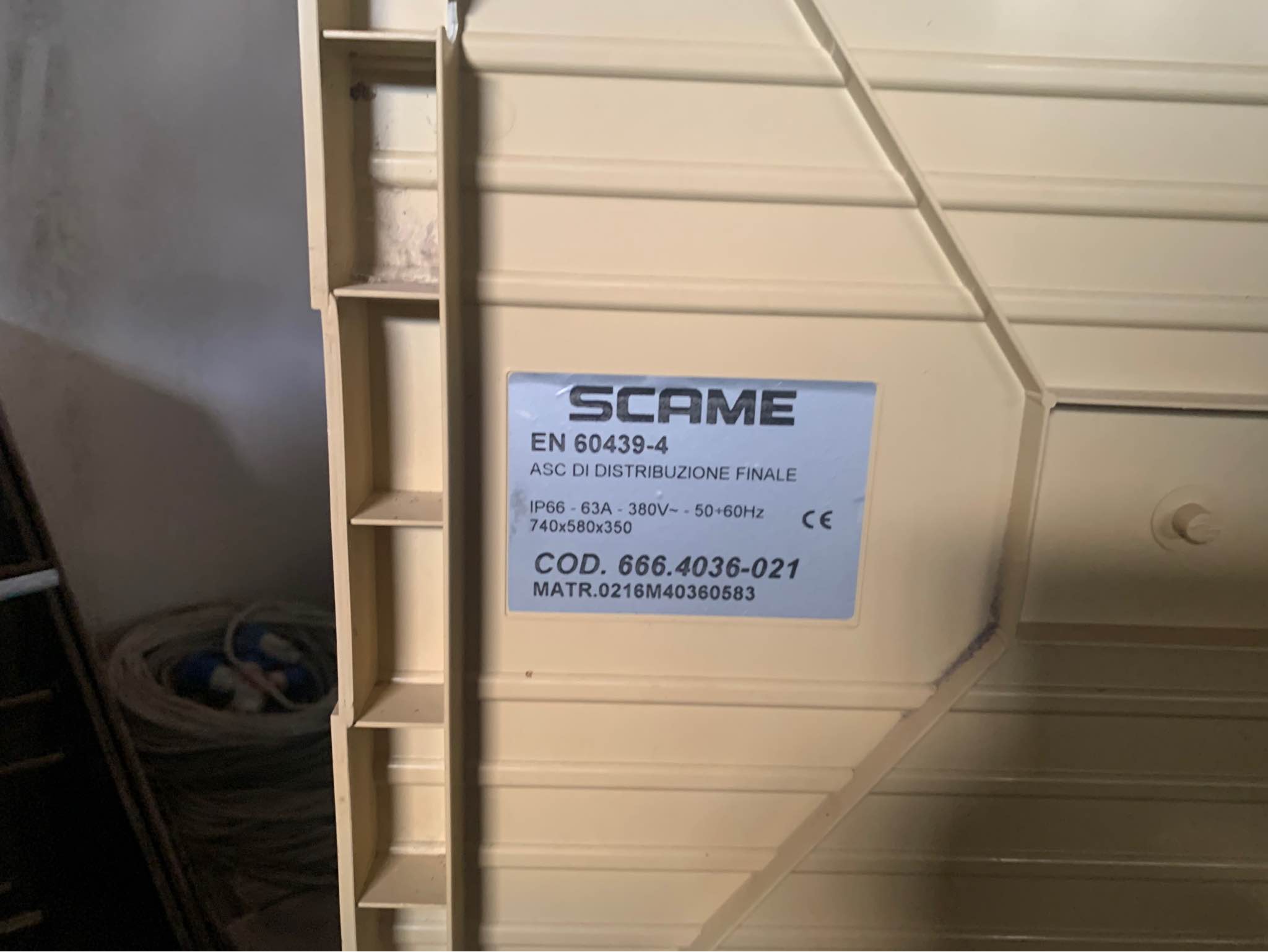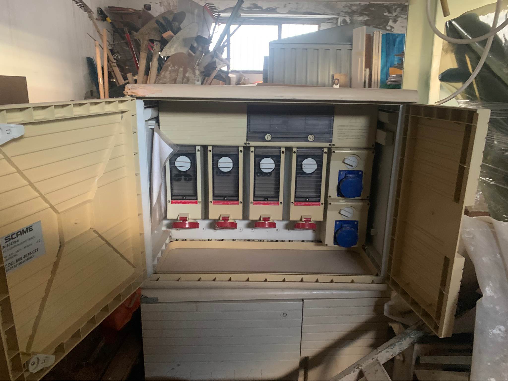 Quadro elettrico cantiere Scame con documenti , ha una presa da 32 , 3 x 16 da 380v e 2 x16 da 220v.