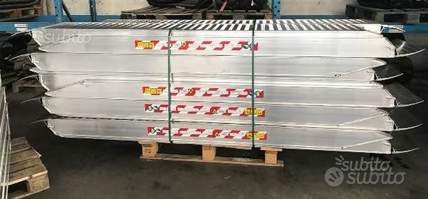 Rampe e Pedane da Carico in Alluminio 6005 Con i Bordi Laterali, Lunghezza 3.20 mt. Portata a coppia 3.300 Kg, Peso complessivo 57 Kg, Larghezza interna 300 mm, Larghezza esterna 350 mm, OMOLOGATE per il trasporto su autocarri, camion e semi rimorchi di mini escavatori bobcat, minipale, rasaerba, trattori gommati e cingolati con la suola in gomma . Fornite di serie con la paletta in alluminio per il fissaggio alla sponda, altrimenti è possibile fermarle con il perno o con la catena. Spedizione in tutta italia con corriere. Prodotte interamente in Italia, Fatturate complete di Certificato CE e Garanzia 12/24 Mesi.