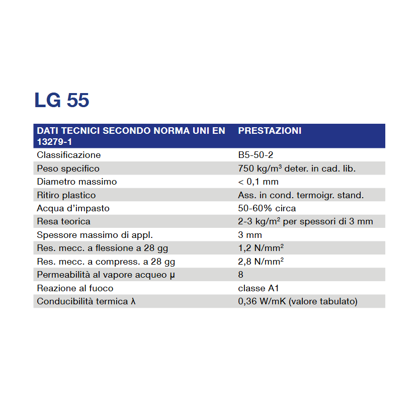 LG 55 è un rasante per interni premiscelato a secco, composto da gesso, calce idrata, inerte calcareo e additivi specifici. Ideale per la lisciatura di superfici intonacate a gesso (come GS 08) e come finitura su intonaci a base calce-legante idraulico ben stagionati. Da utilizzare esclusivamente in ambienti interni asciutti, non indicato su calcestruzzo, intonaci da risanamento o ambienti umidi.