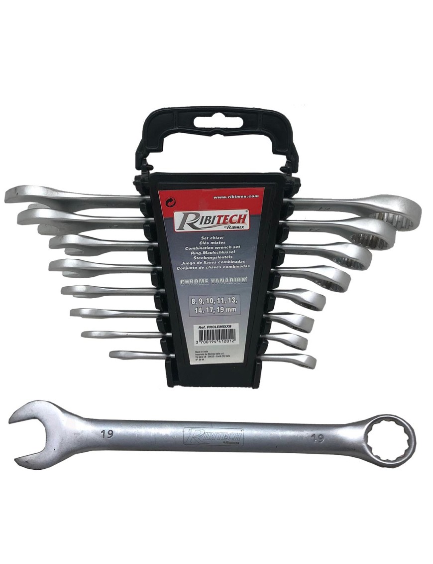 Ribimex PRCLEMIXX8 è un set da 8 chiavi combinate con supporto incluso composte da forchetta da un lato e occhiello dall'altro.