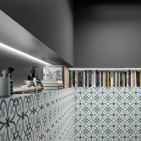 D_Segni Colore è declinata in tre nuance polverose a fondo pieno. Quattro diversi elementi decorativi e una decorazione composta da 15 tappeti arricchiscono la collezione di queste cementine colorate.