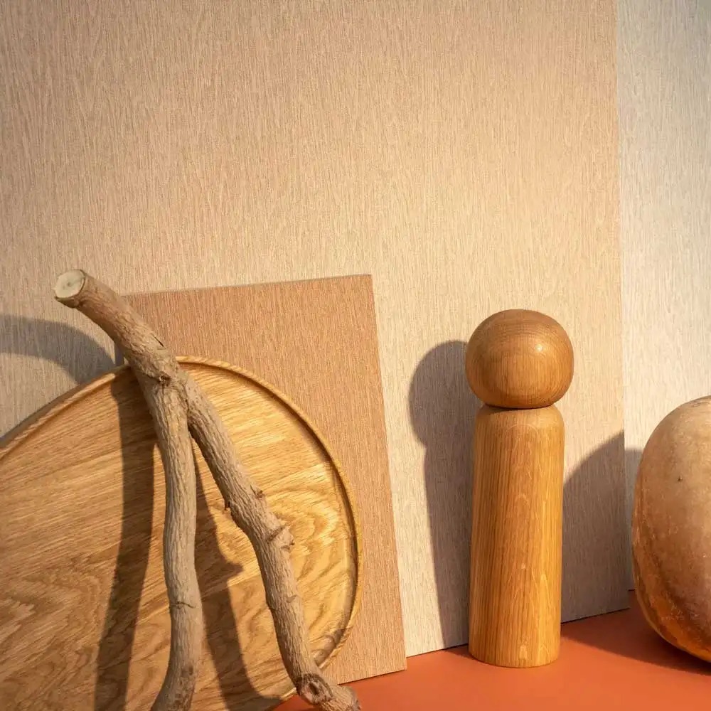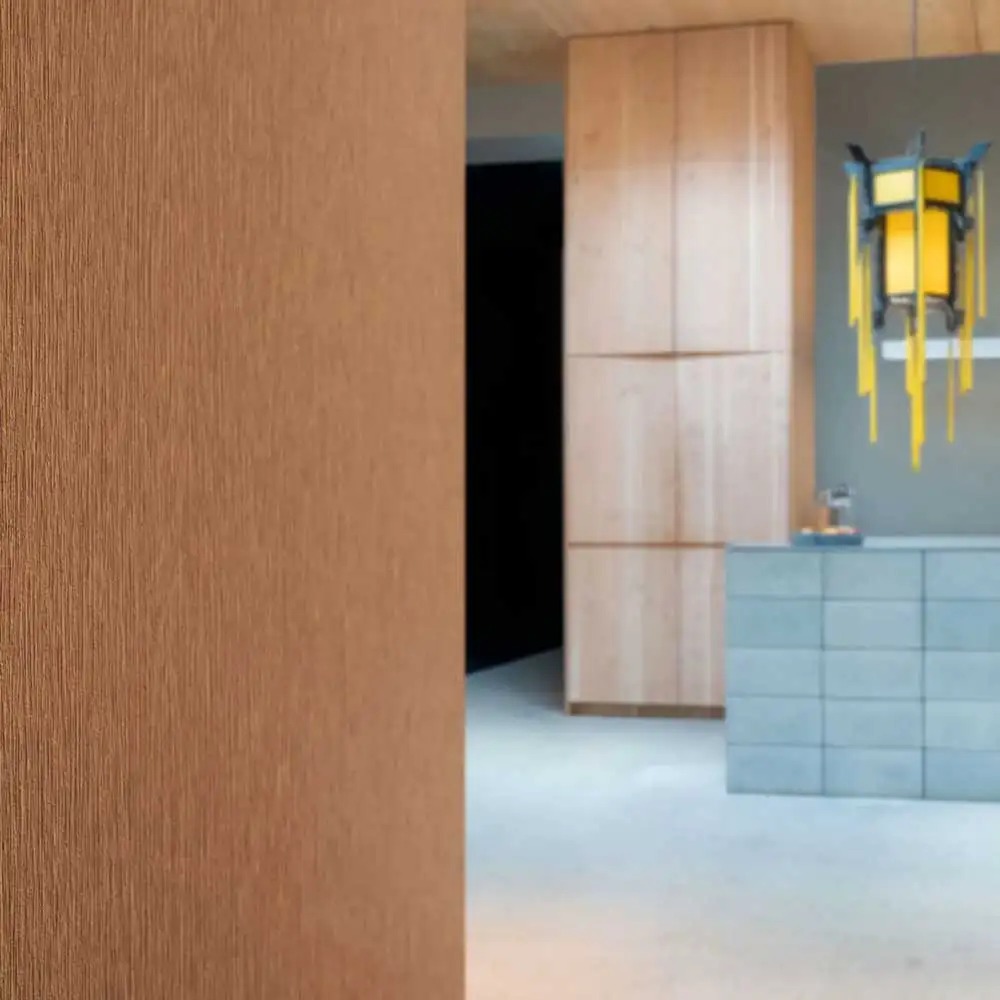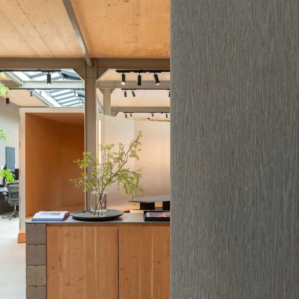 Descrizione: Rivestimento murale in vinile riciclato. Texture a effetto organico-materico in tonalità naturali ed estremamente opache