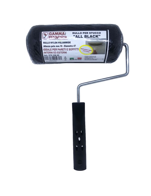 Rullo per stucco All Black in nylon poliammide ideale per pareti e soffitti, interni ed esterni. Altezza pelo da 18 mm e diametro da 47 mm. Prodotto da Gamma Pennelli, interamente Made in Italy.