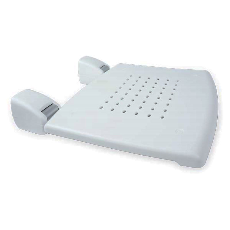 - Sedile per doccia ribaltabile con fissaggio a parete, realizzato in alluminio anodizzato e resine termoplastiche.