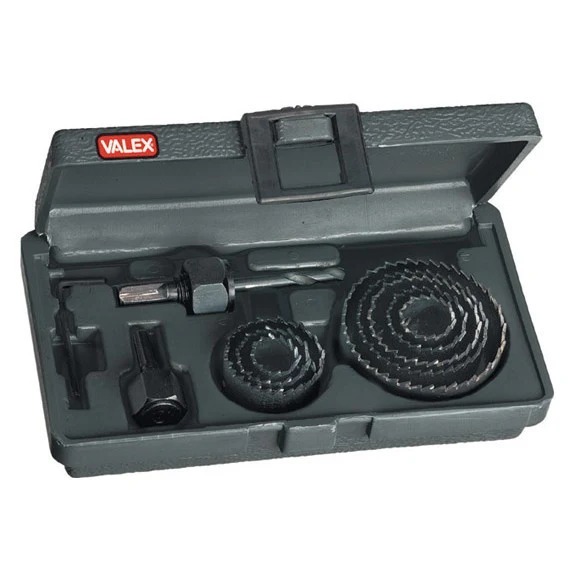 SEGHE A TAZZA IN VALIGETTA PZ.11 SEGHE A TAZZA IN VALIGETTA PZ.11 In acciaio brunito a corpo unico - Ottima per forare legno, plastica, cartongesso - 8 tazze Ø 19-22-29-32-38-44-51-64mm - Altezza totale 24mm - 2 adattatori, 1 punta di centraggio con codolo circolare, 1 chiave esagonale.