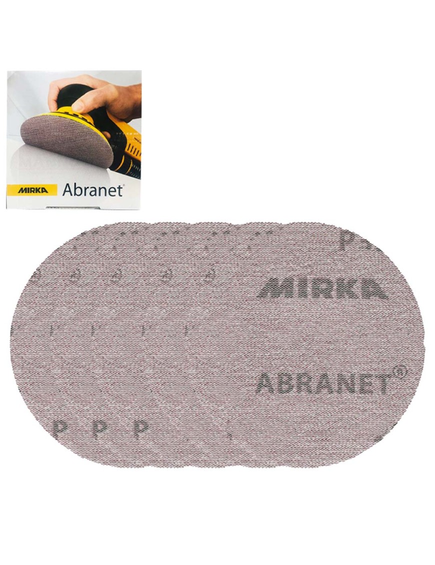Set di 5 dischi di carta abrasiva professionali Mirka Abranet dal diametro di 150 mm e grana a scelta. La levigatura è più efficace economica e senza polvere o quasi. Grazie alla sua retina poliammidica permette la massima aspirazione delle polveri da carteggiatura. Ideale per moltissimi materiali tra cui diversi tipi di acciaio, intonaco, stucco, legno, e molto altro.
