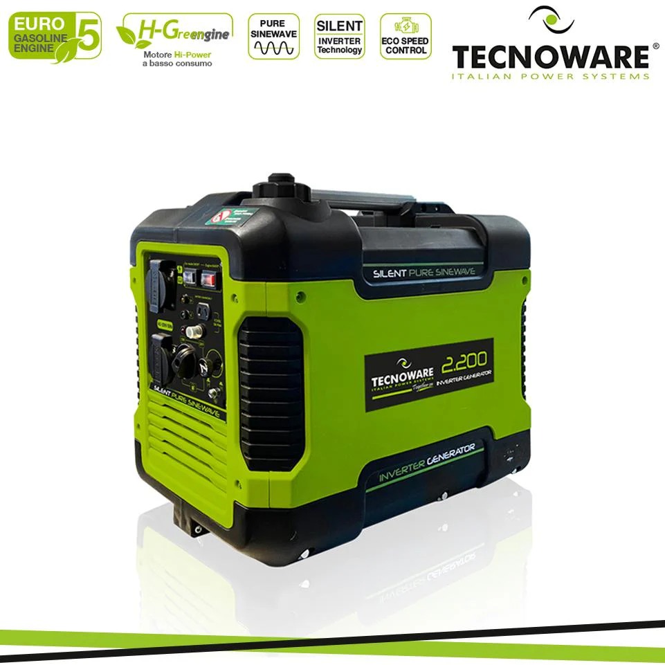 SILENT INVERTER GENERATOR 2200VA RECOIL STARTING SYSTEM.GENERATORE ad Inverter silenziato, potenza di picco 2200VA con sistema sistema ECO Speed Control, per l'ottimizzazione dei consumi e la riduzione del rumore, motore a scoppio OHV (4 tempi) alimentato a benzina (H-Greengine Hi-Power con basso consumo). Capacità serbatoio 4 L. Accensione manuale tramite corda a strappo. Dotato di 2 prese di uscita Schuko da 16A e di una uscita 12V dc 8A. Dimensioni 48x39x28 cm peso 21,5 Kg.SPECIFICHE:.Generatore ad Inverter silenziato.Sistema Eco Speed Control per l’ottimizzazione dei consumi e la riduzione del rumore.Portatile e compatto.Accensione manuale tramite corda a strappo.Motore OHV a 4 tempi.Generazione tensione d’uscita sinusoidale.Serbatoio per carburante con capacità per 10 ore al 50% del carico.Allarme livello olio.Protezione da sovraccarico.Caricabatteria.Doppia uscita AC e DC 12V.