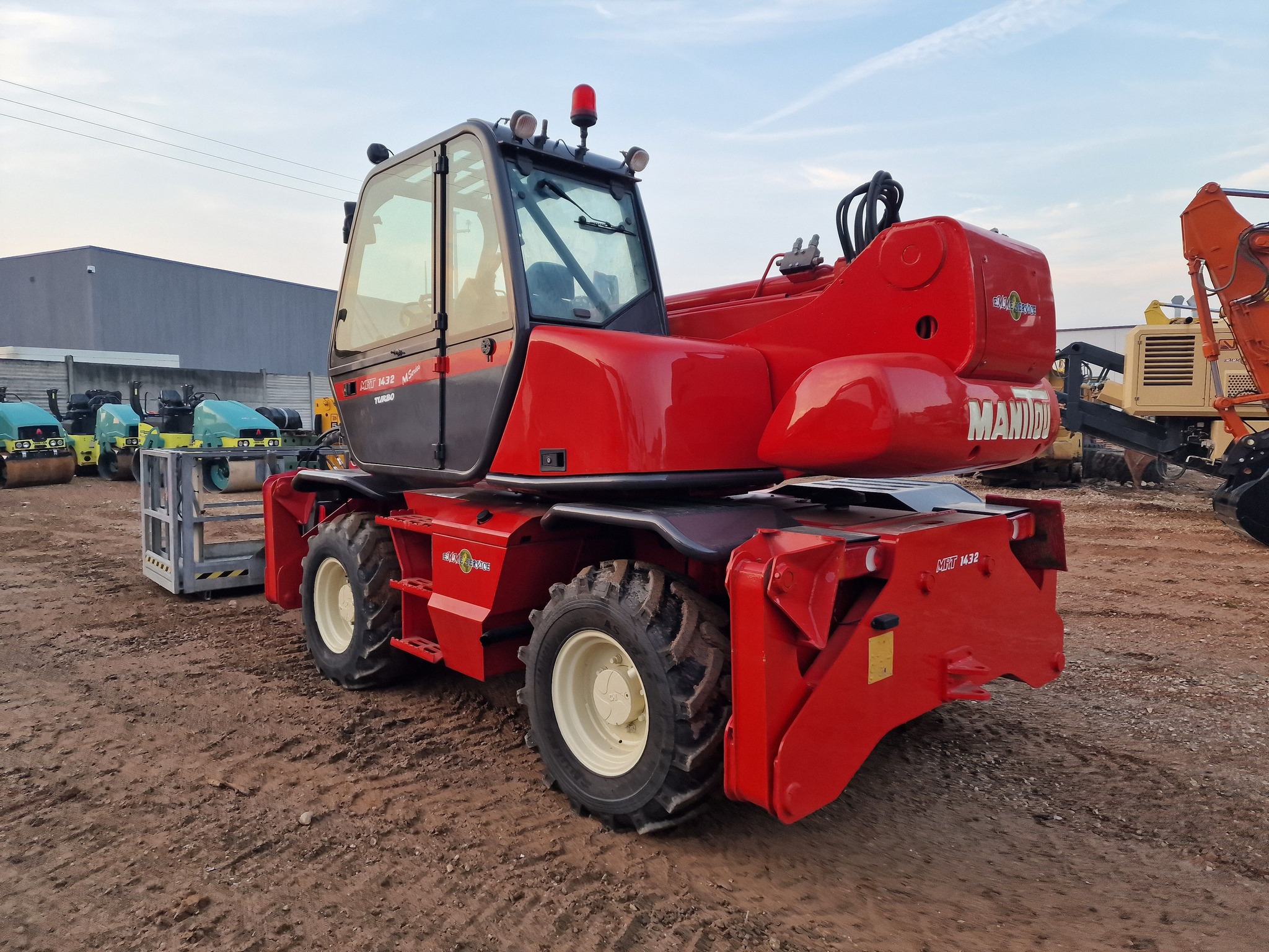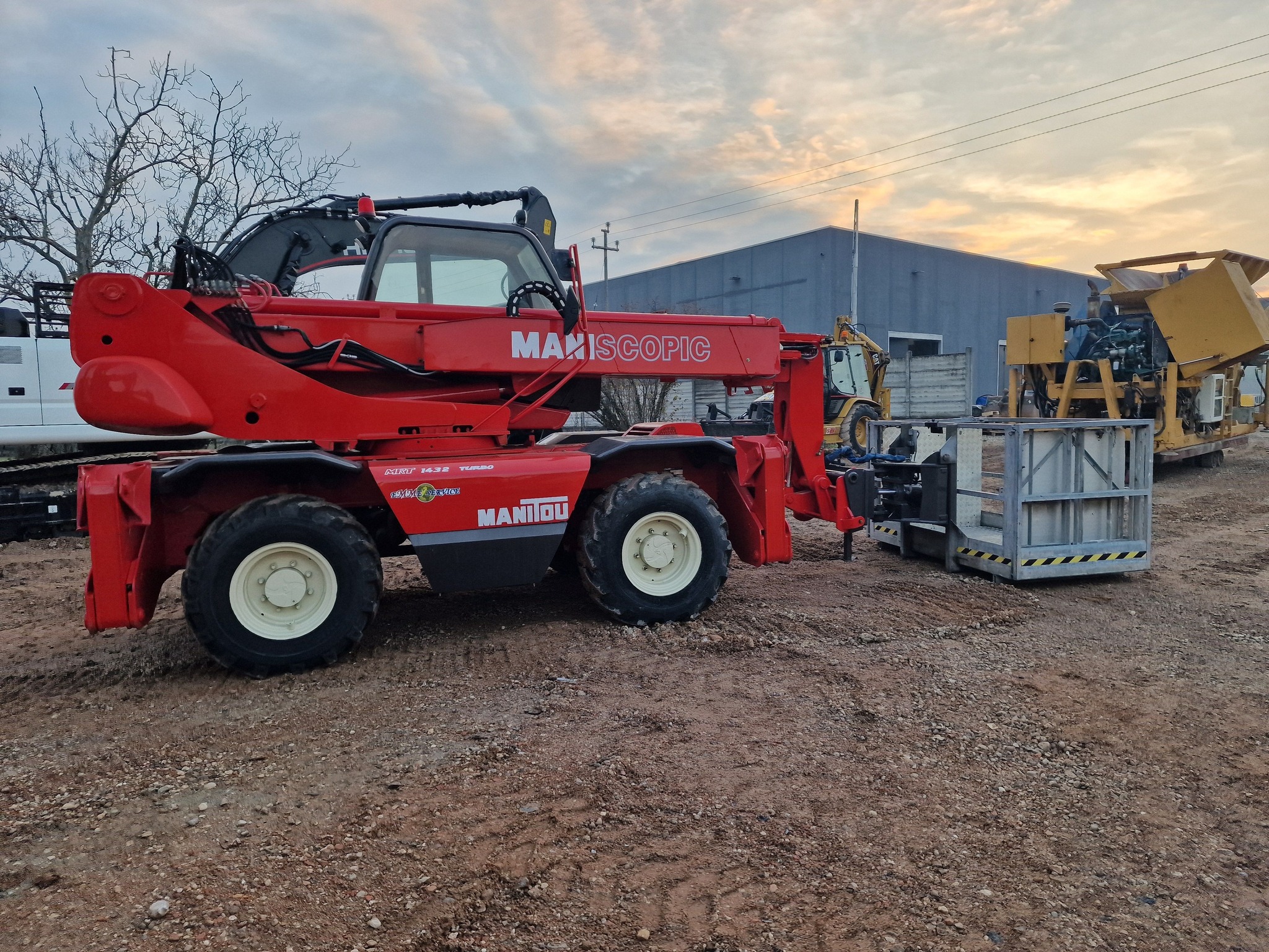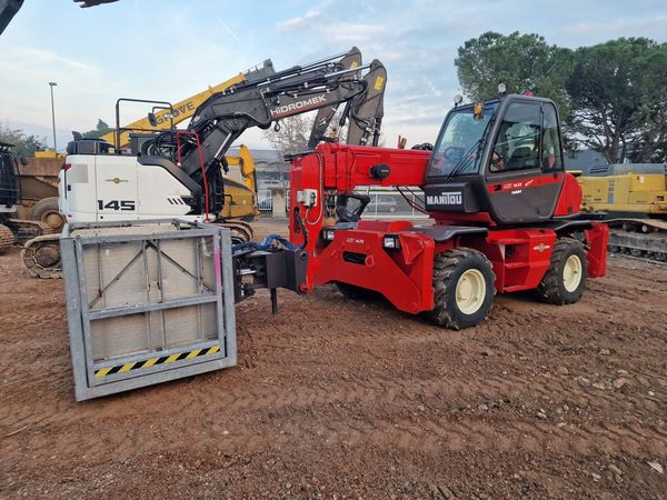 SOLLEVATORE TELESCOPICO MARCA MANITOU MRT 1432, ANNO 2002, ORE 8000, COMPLETO DI COPPIA FORCHE, BENNA, VERICELLO IDRAULICO SU ZATTERA, CESTA PORTA PERSONE.