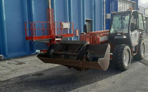 Sollevatore telescopico MANITOU MVT 1135 con motore Perkins. Altezza 11 metri. Portata 35 q.li. Anno 1999. Macchina completa di pala caricatrice, forche e gancio. Targa e libretto di circolazione stradale.