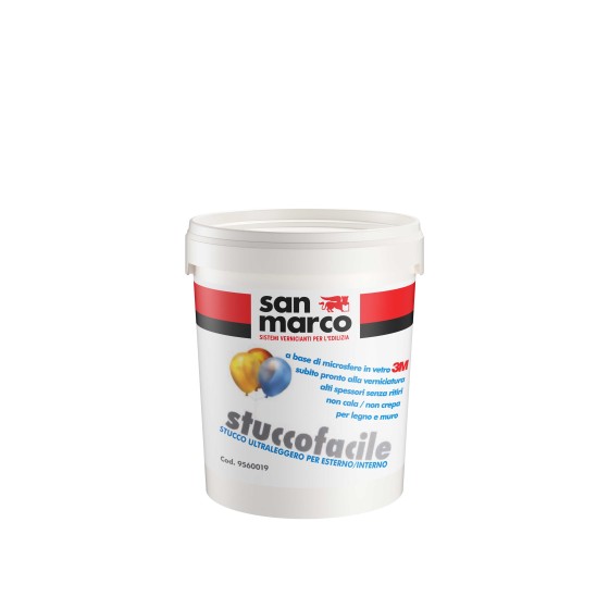 STUCCOFACILE è uno stucco pronto in pasta per esterni ed interni a base di microsfere cave in vetro, per applicazioni su supporti murali e legno. Facile da applicare, rapido in essiccazione, consente di realizzare grossi spessori senza ritiri e screpolature. Non ingiallisce, aderisce perfettamente a qualsiasi superficie ed è presto sovraverniciabile con pitture sintetiche in dispersione acquosa. Particolarmente indicato per la stuccatura dei fori lasciati dai ponteggi.
