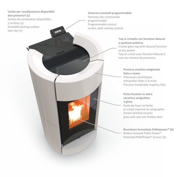 Al cuore della stufa batte il bruciatore brevettato PelletPower®, che coniuga potenza e pulizia della combustione; in versione Natural Plus, puoi inoltre sfruttare il top in cristallo con funzione “Natural” a qualsiasi potenza, per tenere in caldo pietanze e bevande. Completa il sistema il pannello comandi programmabile con comodo telecomando wireless e, in opzione, il modulo iControl Wi-Fi per il controllo via app e il Termostato Room Control.