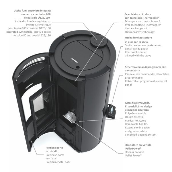 La stufa a pellet POPSTAR™ Cristallo unisce funzionalità e charme del fuoco in un design compatto e contemporaneo. La preziosa porta in vetro ceramico serigrafato esalta la visione della fiamma, mentre il bruciatore brevettato PelletPower® garantisce combustioni pulite e consumi contenuti, con un’autonomia di riserva di 27 kg di pellet che unisce praticità ed efficienza . Lo scambiatore Thermocore® assicura un rendimento fino al 95,8 %, riducendo emissioni e valorizzando ogni kilowatt prodotto .