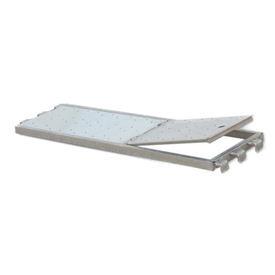 Tavola metallica con botola realizzata in acciaio zincato, dotata sul piano di calpestio di elementi sporgenti per l’antiscivolo.