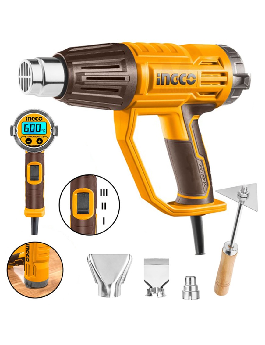 Termosoffiatore elettrico da 2000W con temperatura regolabile da 50°C a 600°C e display LCD per un controllo preciso. Dotato di doppia velocità del flusso d'aria (300/450 L/min), è ideale per sverniciare, modellare plastica, asciugare e altri lavori termici. Incluso nella confezione: 3 ugelli e 1 raschietto.