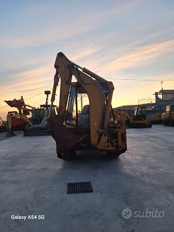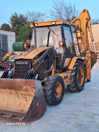 Terna Caterpillar 428C, anni 2000, ore 7000. Con targa e libretto, benna mordente, macchina in buone condizioni, da rivedere carrozzeria.