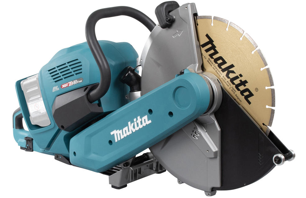 Troncatrice 80Vmax alimentata da 2 batterie da 40V, dotata di disco diamantato a settori da Ø355 è capace di tagli a secco su laterizi con una capacità massima di 127mm; questa tipologia di macchina necessità di un'unità esterna per la gestione delle polveri. Fornita senza batterie e caricabatterie.