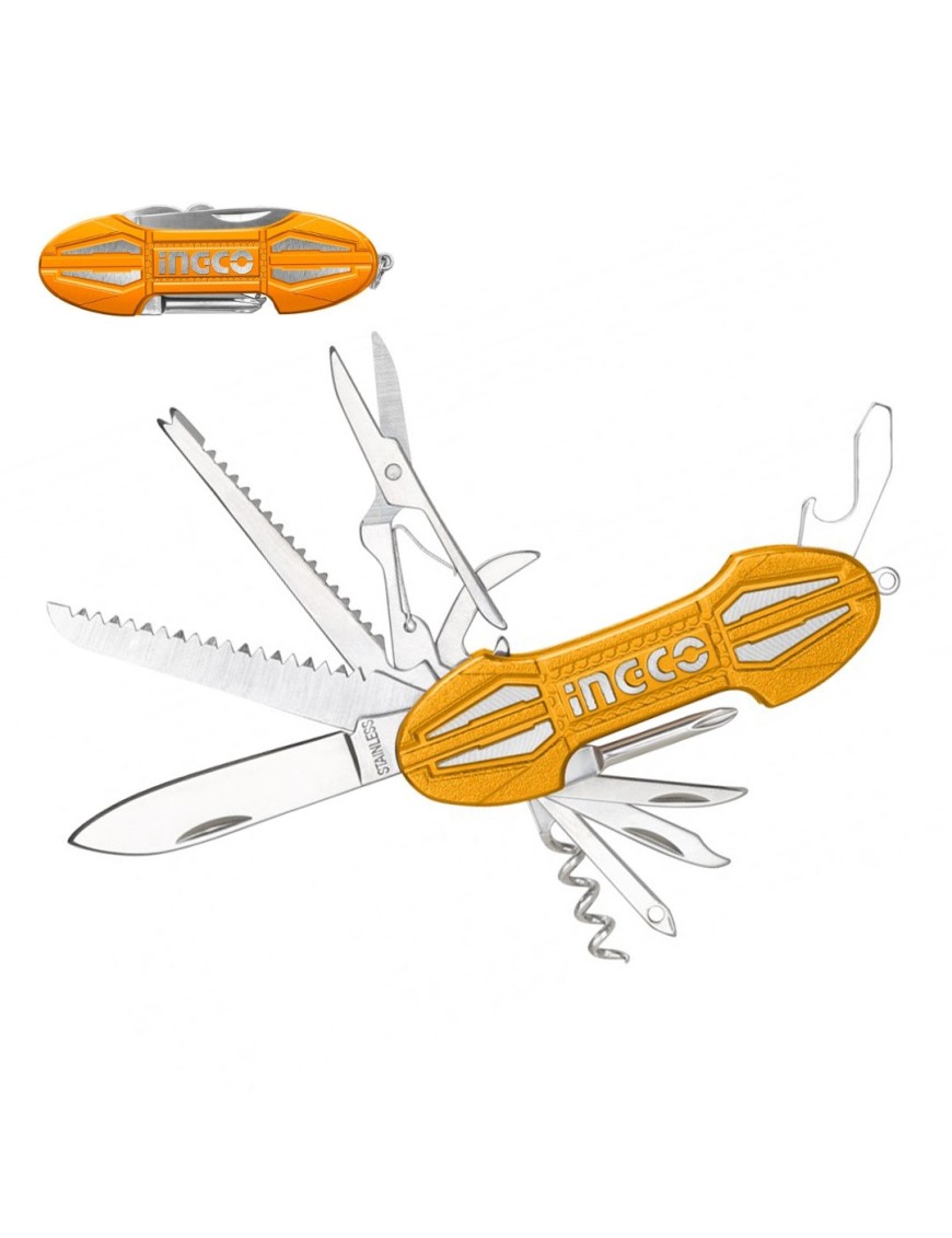 L'utensile multifunzione Ingco HFMFT0115 è realizzato in acciaio inossidabile con impugnatura in gomma morbida per una presa confortevole. Compatto e pieghevole, misura 155 mm aperto e 100 mm chiuso, ideale per un facile trasporto. Offre 15 funzioni, tra cui pinze, coltelli, cacciaviti, sega e apribottiglie. Include una custodia in nylon appendibile alla cintura.
