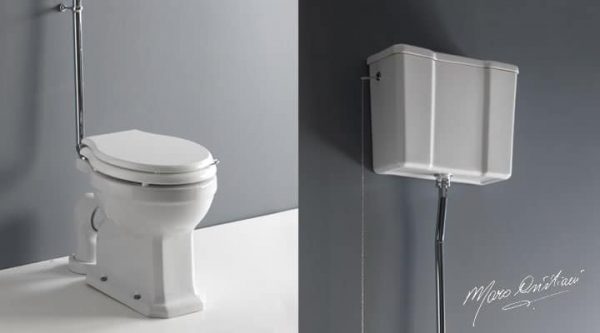 Il Vaso a cacciata con cassetta alta della serie “Palazzo Reale” comprende vaso, cassetta alta con coperchio, copriwater, batteria per cassetta alta con tubo, catena e pomolo in ceramica cromo. La sobrietà nello stile, unitamente alla ricercatezza delle rifiniture che impreziosiscono d’oro la sua struttura, lo rendono un elemento fortemente bilanciato.
