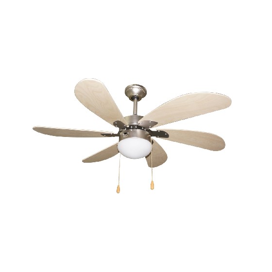 Ventilatore a soffitto dotato di 6 pale in legno MDF. Color abete e corpo in ottone anticato. Utilizzabile in 3 velocità regolabili con catena a tiro leggero. Lampadina con attacco E27,1. Lampadina non inclusa. Diametro pale 107 cm(DianFlex)