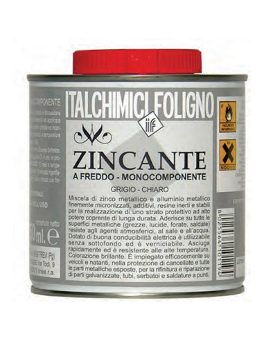 Miscela di zinco metallico e alluminio metallico finemente micronizzati, additivi, resine inerti e stabili per la realizzazione di uno strato protettivo ad alto potere coprente di lunga durata. Aderisce su tutte le superfici metalliche (grezze, lucide, forate, saldate), resiste agli agenti atmosferici, al sale e all’acqua. Dotato di buona conducibilità elettrica è utilizzabile senza sottofondo ed è verniciabile. Asciuga rapidamente ed è resistente alle alte temperature. Colorazione brillante. Diluizione con diluente sintetico. E’ impiegato efficacemente su veicoli e natanti, nella protezione di cancellature e tutte le parti metalliche esposte, per la rifinitura e riparazione di parti galvanizzate, tubi, serbatoi e saldature a punti. Resa 10/12 mq/lt.